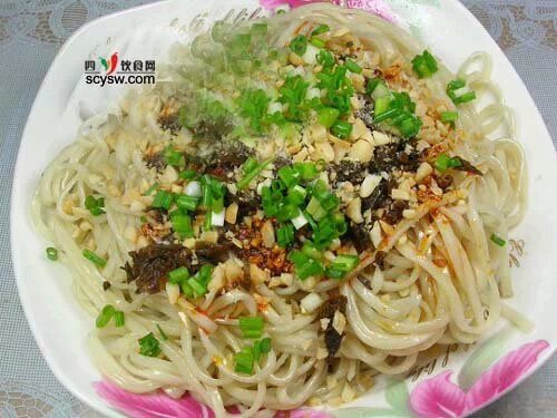 4、将调味料放面碗内,盛入面条,铺少许炒好的榨菜肉丝并撒葱花少许即成。